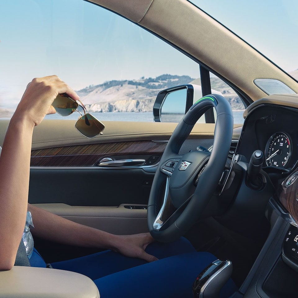 - Hands-free power liftgate with programmable memory height and Cadillac-branded projection light